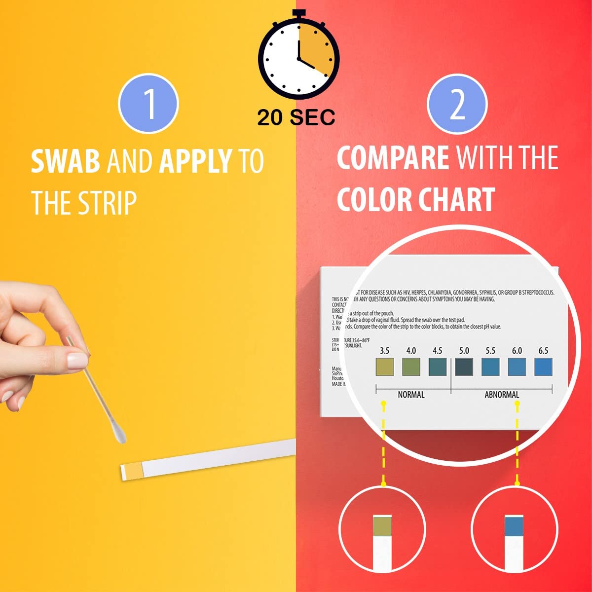 - 💖EASY TO USE: To use the test, obtain a sample of vaginal fluid using a cotton swab. Apply the sample to the reagent pad at the tip of the test strip and wait for 20 seconds. Then, compare the color of the strip to the color chart provided in the product label. Please note that yeast infections often do not result in an elevated vaginal pH level, so the test strip may not change color even if you are experiencing symptoms. Do not use urine or tap water on the test strip.
