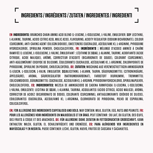 branched chain amino acid blend( L-leucine, L-isoleucine, L-valine, emulsifier( SOY LECITHIN)), L-alanine, Taurine, acids( citric acid, Malic Acid), flavourings, acidity regulator( sodium bicarbonate), colourants( curcumin), anti-caking agent( silicon dioxide), sweeteners( sucralose, acesulfame potassium), L-arginine, pyridoxine hydrochloride, spirulina powder, cholecalciferol