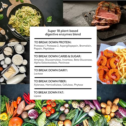 - For belly bloat to break down food | 18 essential enzymes that digest proteins, carbs, fruits, veggies, beans, dairy, & fats to cover all diets | Gluten Free, non GMO, produced in US in an approved facility following all GMP standards | Vegetarian