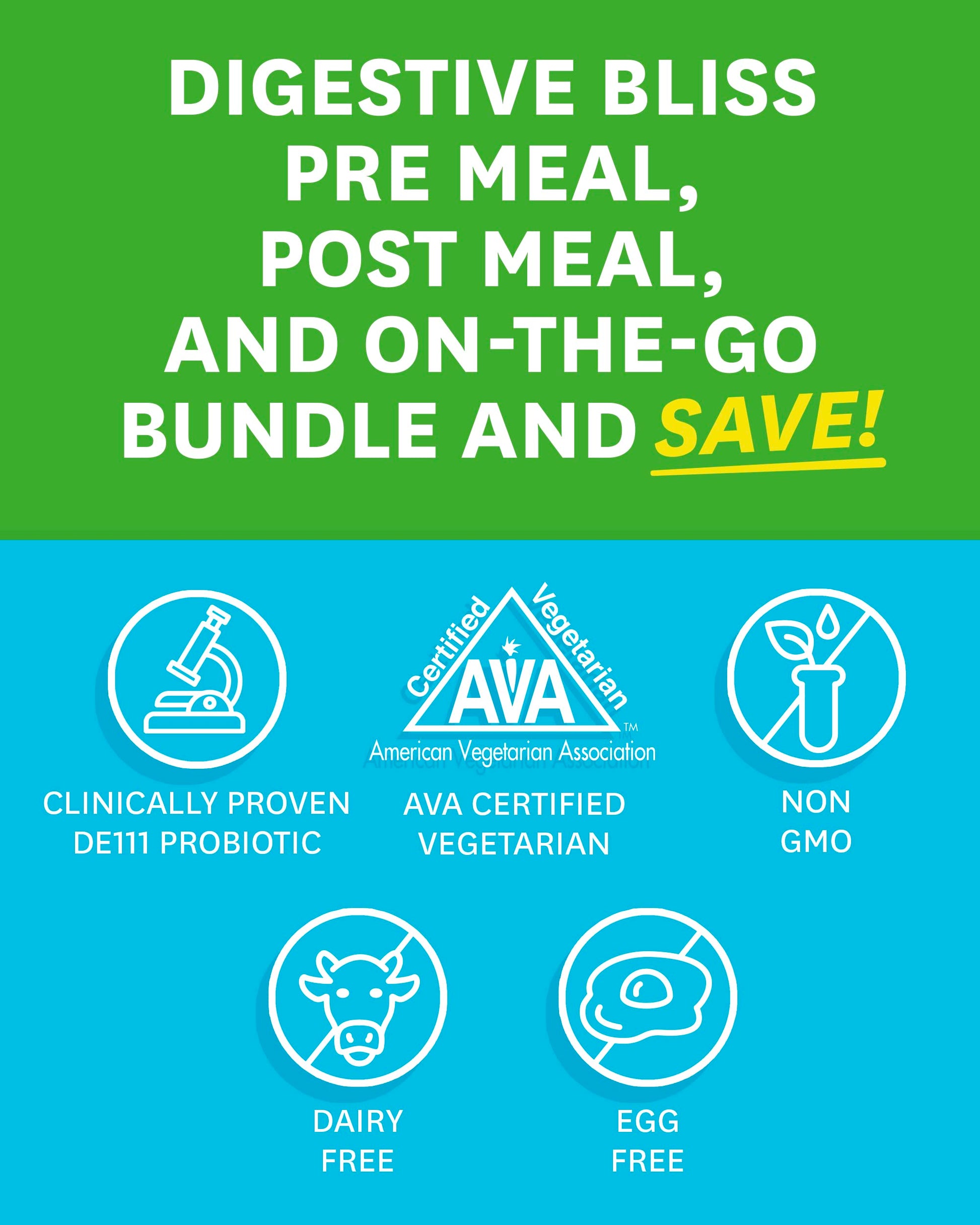 - Pre meal Support with Digestive Enzymes: One before each meal, see how good you’ll feel. Features digestive enzymes, prebiotics, and probiotics with clinically-proven DE111 to break down hard-to-digest foods and aid nutrient absorption